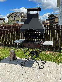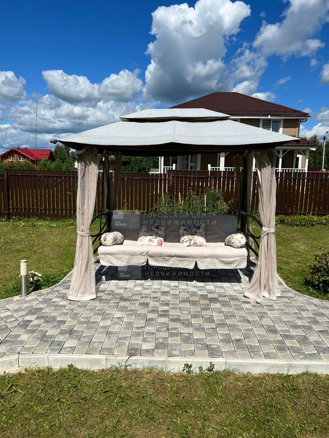 Выделена мангальная зона, установлены садовые качели, укрытые балдахином.