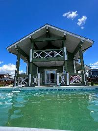 На участке напротив террасы в теплое время года установлен глубокий (1,4м) разборный бассейн (8Х5м) с прозрачной водой.