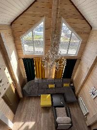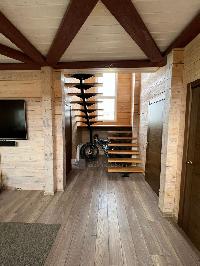 1 эт. крытое крыльцо, светлая просторная гостиная со вторым светом (потолки 7 м), большая кухня с барной стойкой из натурального дерева, столовая с выходом на крытую террасу 30м2, спальня, с/у с душевой кабиной, котельная, кладовая