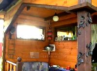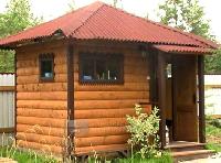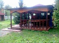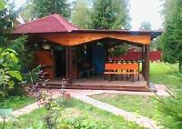Второе строение - остекленная кухня с большой верандой под крышей. К ней подведена вода, газ баллон в сейфе. Позади кухни хозблок. Отдельно стоящий сан узел - в котором туалет и душевая. Вода из колодца. Все строения выполнены в одном стиле - отделаны блок-хаусом. Окна резные, на крышах стильные флюгеры. Дорожки выложены декоративной плиткой.