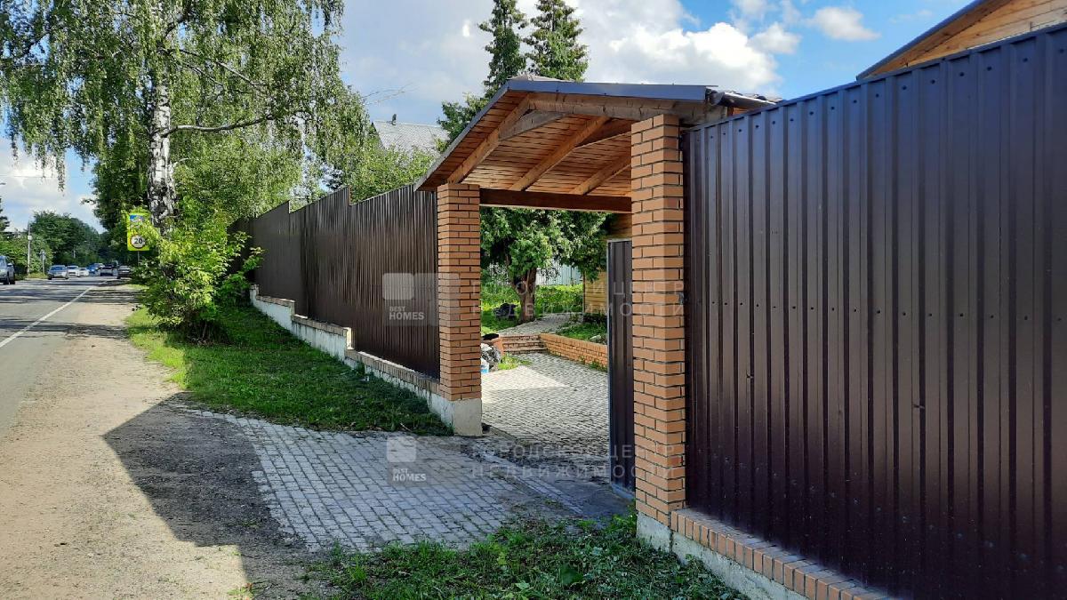 Участок 13 соток, Г-образной формы, со всех сторон огорожен забором из профнастила, при въезде ворота и навес из которого въезд в гараж.