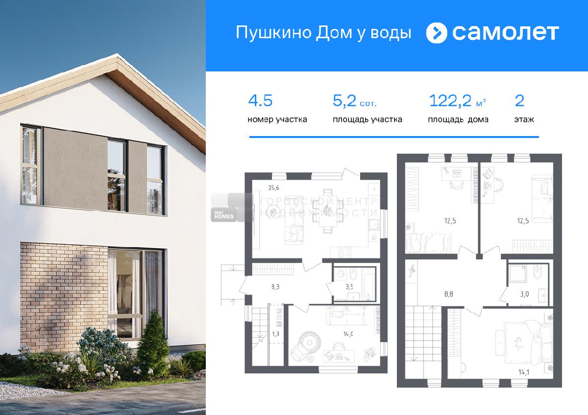 В продаже дом площадью 122,2 м2 на участке 5.19 от застройщика «Самолет» в загородном проекте «Пушкино дом у воды».