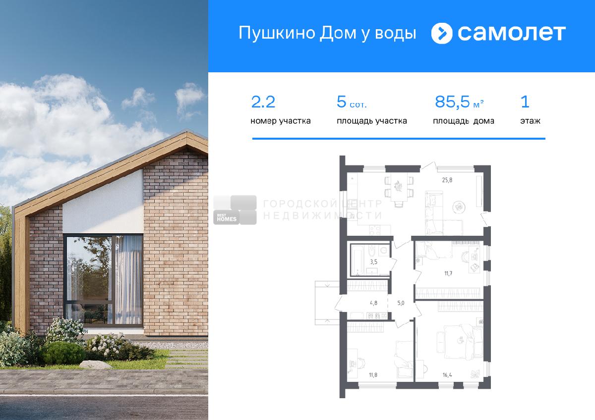 В продаже дом площадью 85,5 м2 на участке 5.01 от застройщика «Самолет» в загородном проекте «Пушкино дом у воды».