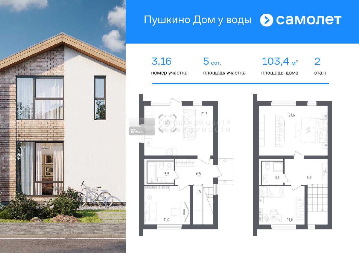 В продаже дом площадью 103,4 м2 на участке 5.01 от застройщика «Самолет» в загородном проекте «Пушкино дом у воды».