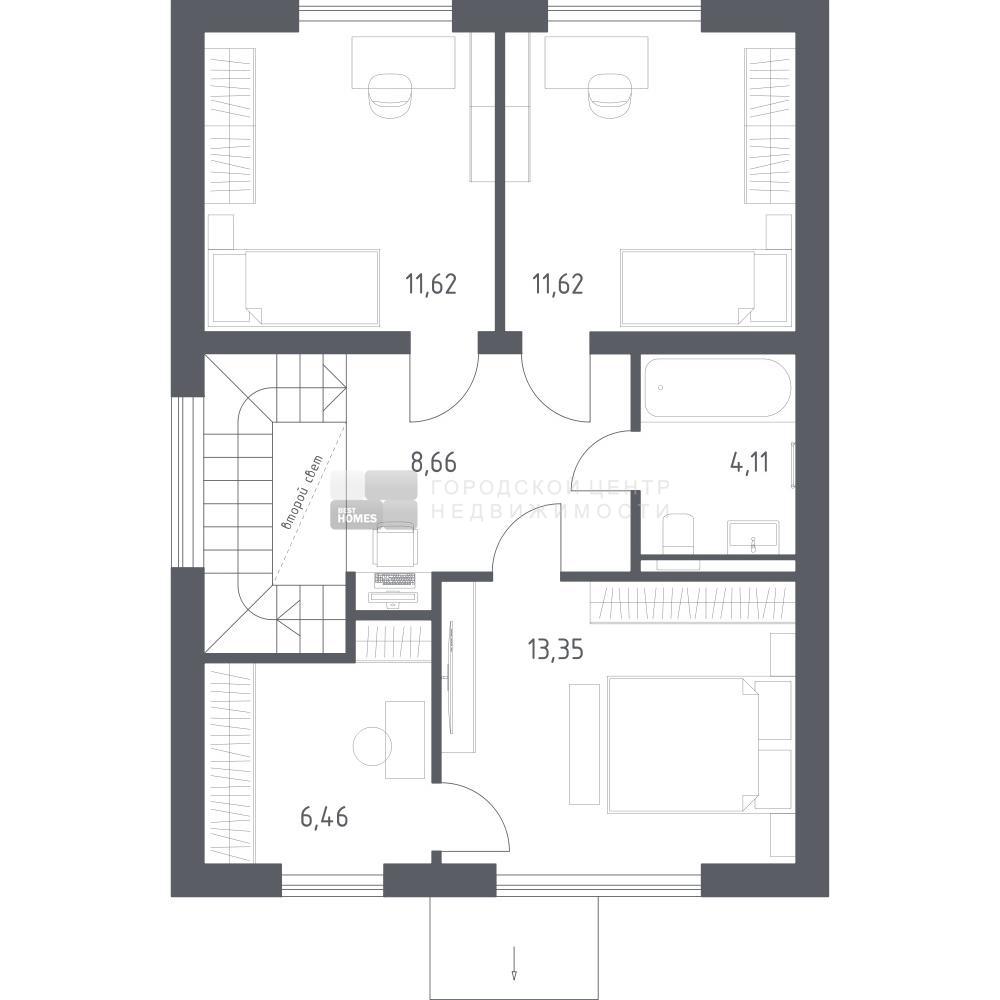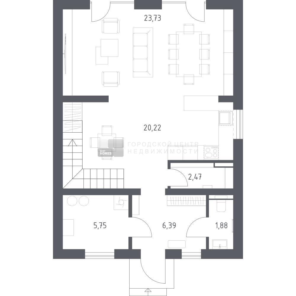 В базовую комплектацию включена металлическая входная дверь, двухкамерные стеклопакеты. Отсутствие межкомнатных перегородок позволит вам адаптировать пространство под себя.