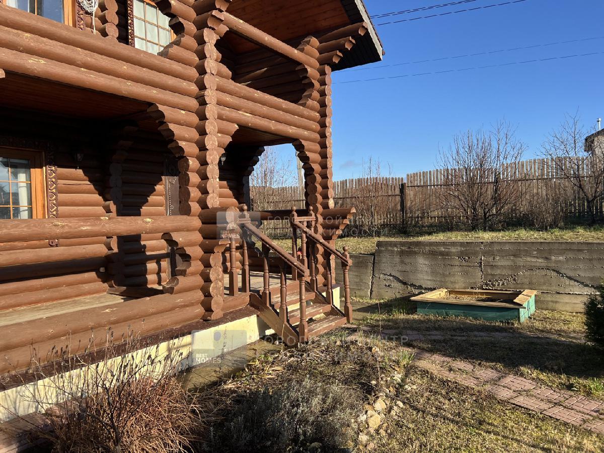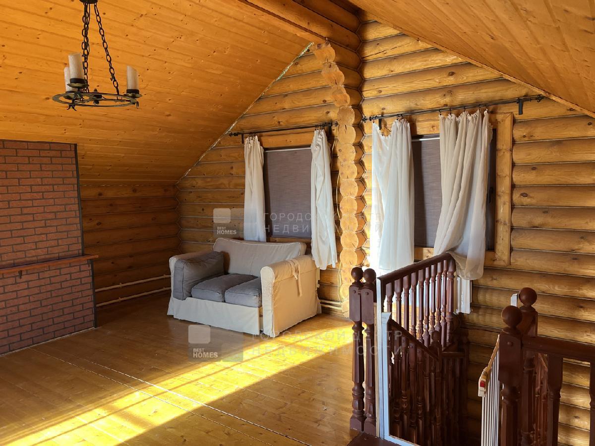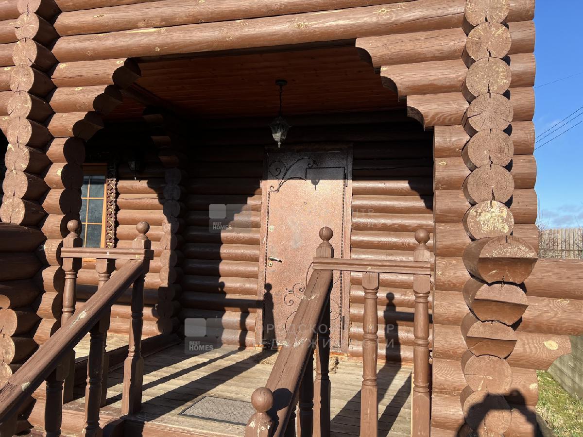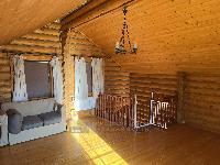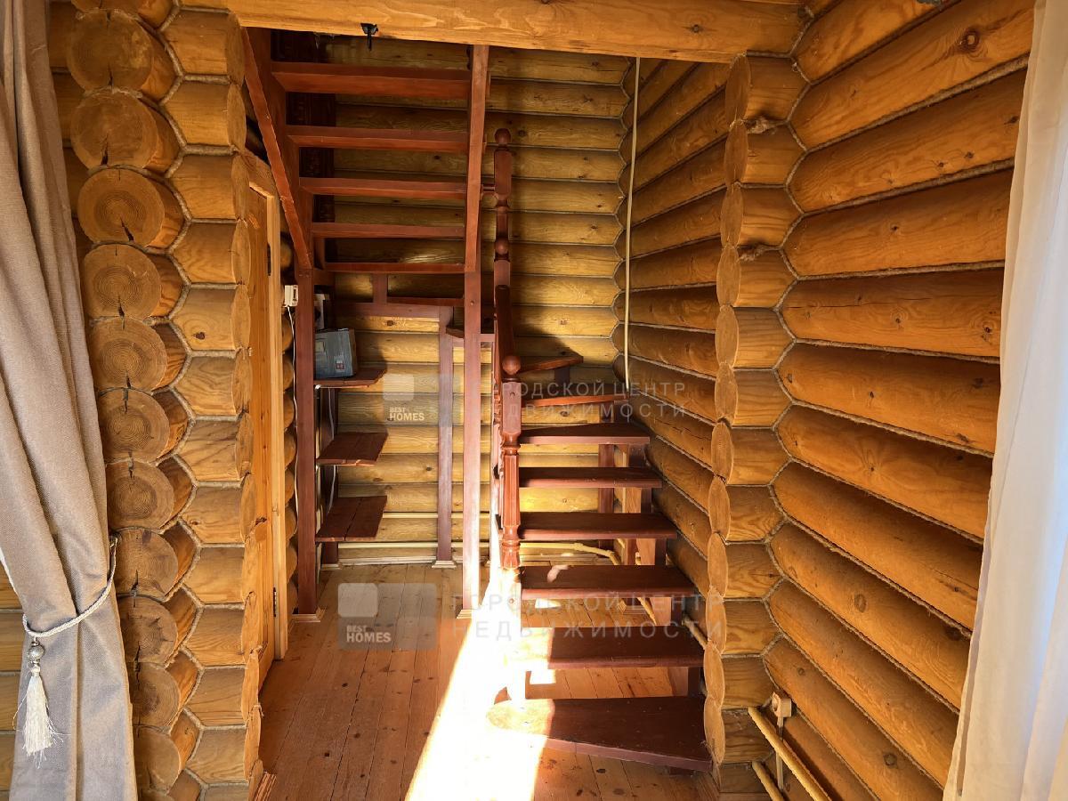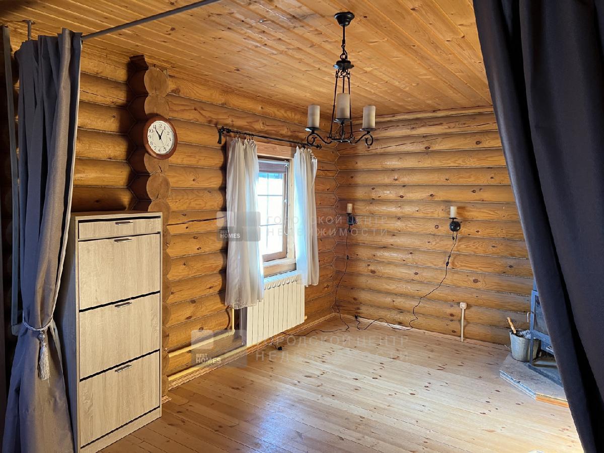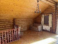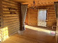 Материал стен оциллиндрованное бревно диаметром 220 мм. Обработано снаружи пропиткой темно-коричневого цвета. Внутри интерьер цвета натурального дерева.