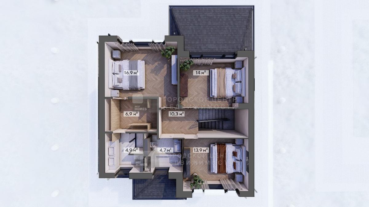 На втором этаже- три спальни, одна из которых с гардеробной и отдельным санузлом