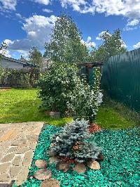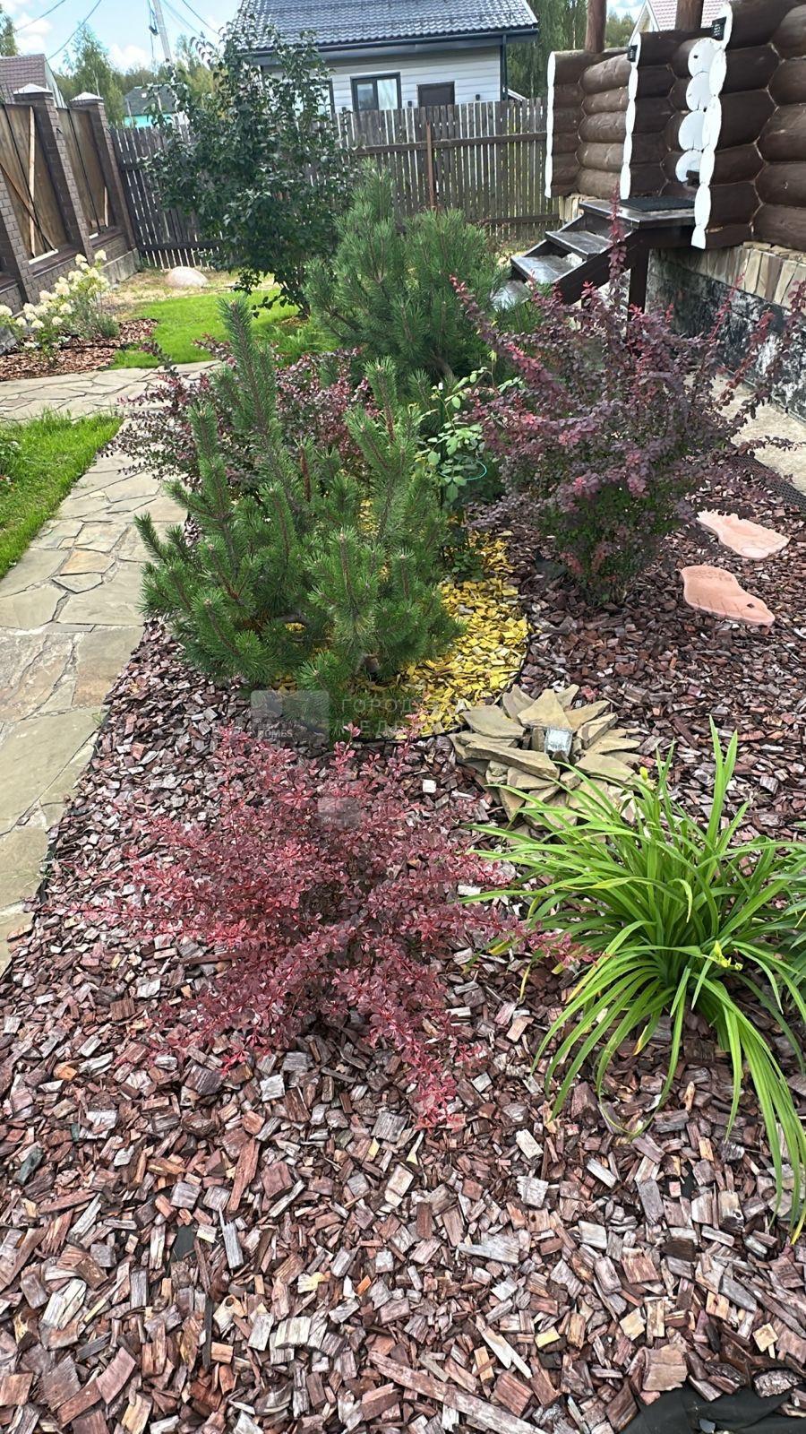 Выполнен ландшафтный дизайн, посажены молодые яблони, вишни, груши, крыжовник, смородина, малина, ежевика, жимолость, сирень,