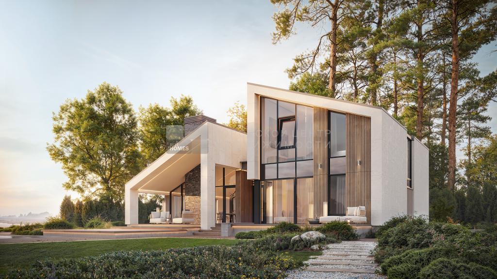 Вилла “Дэнфорд” – это пространство для здоровья и отдыха. На первом этаже расположена мастер-спальня со своей ванной и гардеробной, кабинет и кухня-гостиная. На втором этаже – 2 мастер-спальни со своими ванными и гардеробными комнатами. Выразительная двухчастная структура дома, позволяющая автономно реализовывать различные сценарии жизни для большей приватности.