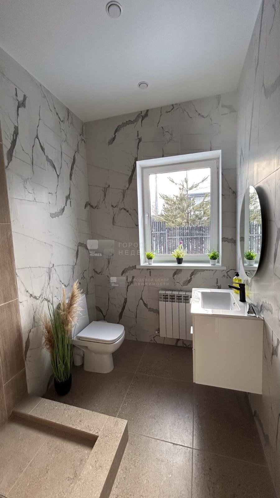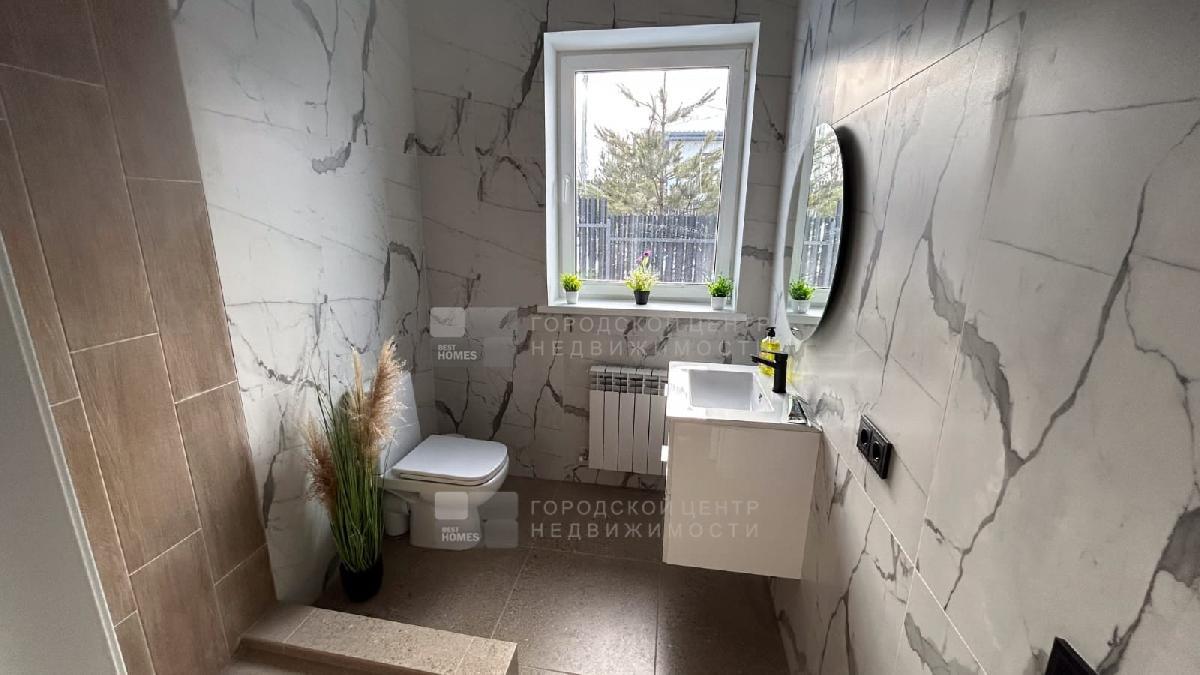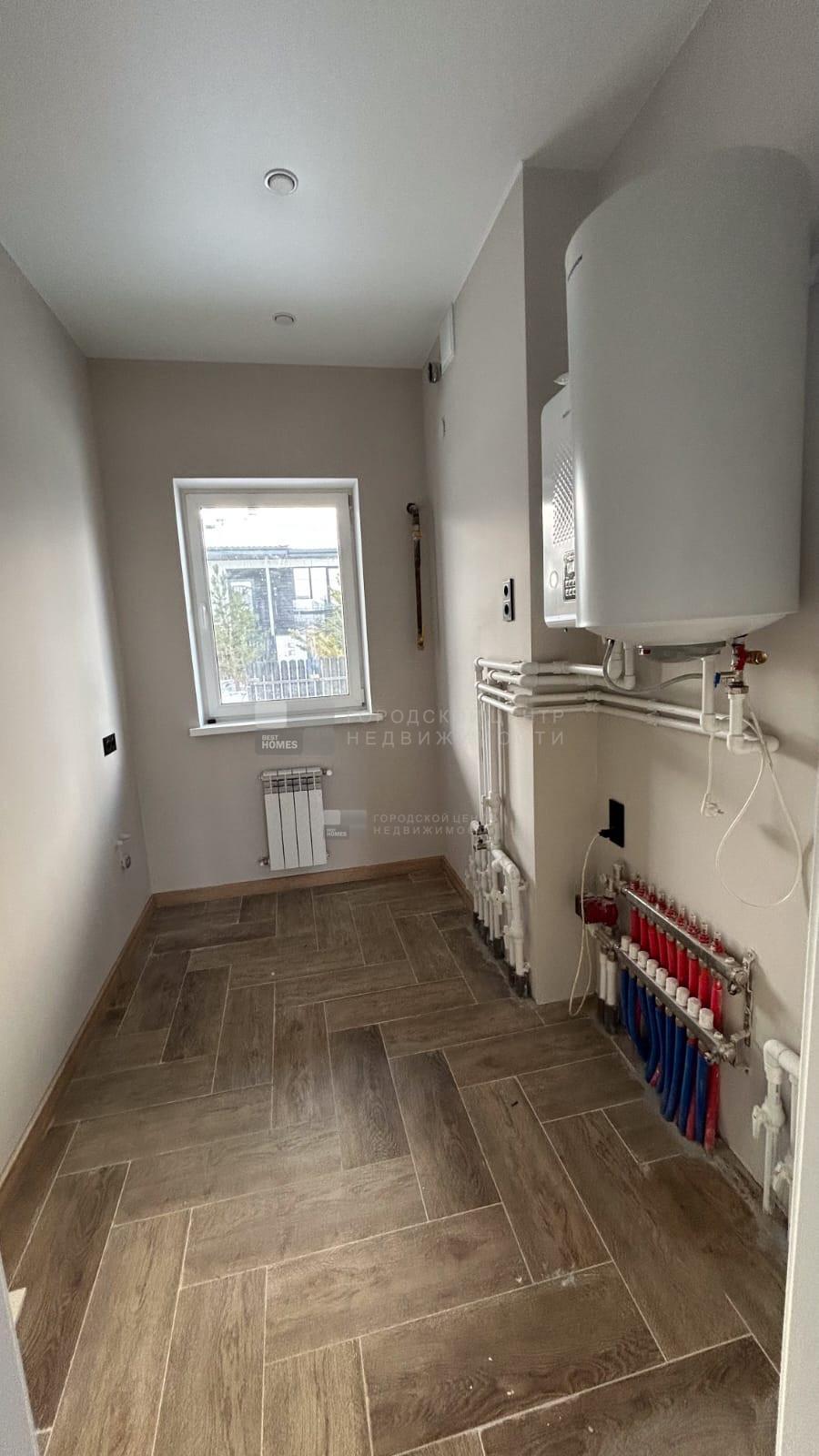 В доме водяные теплые полы, материал пола керамогранит, стены обои и покраска, потолок натяжной, в доме установлена сантехника и освещение.