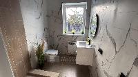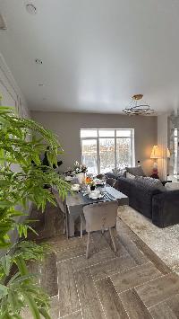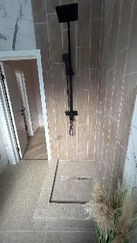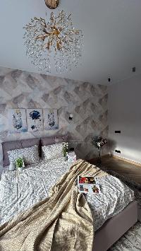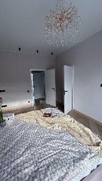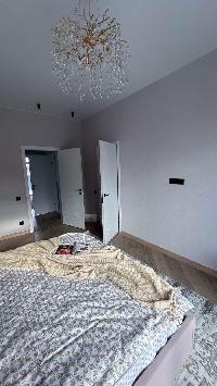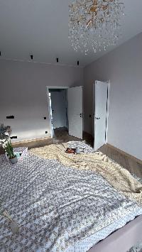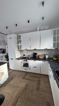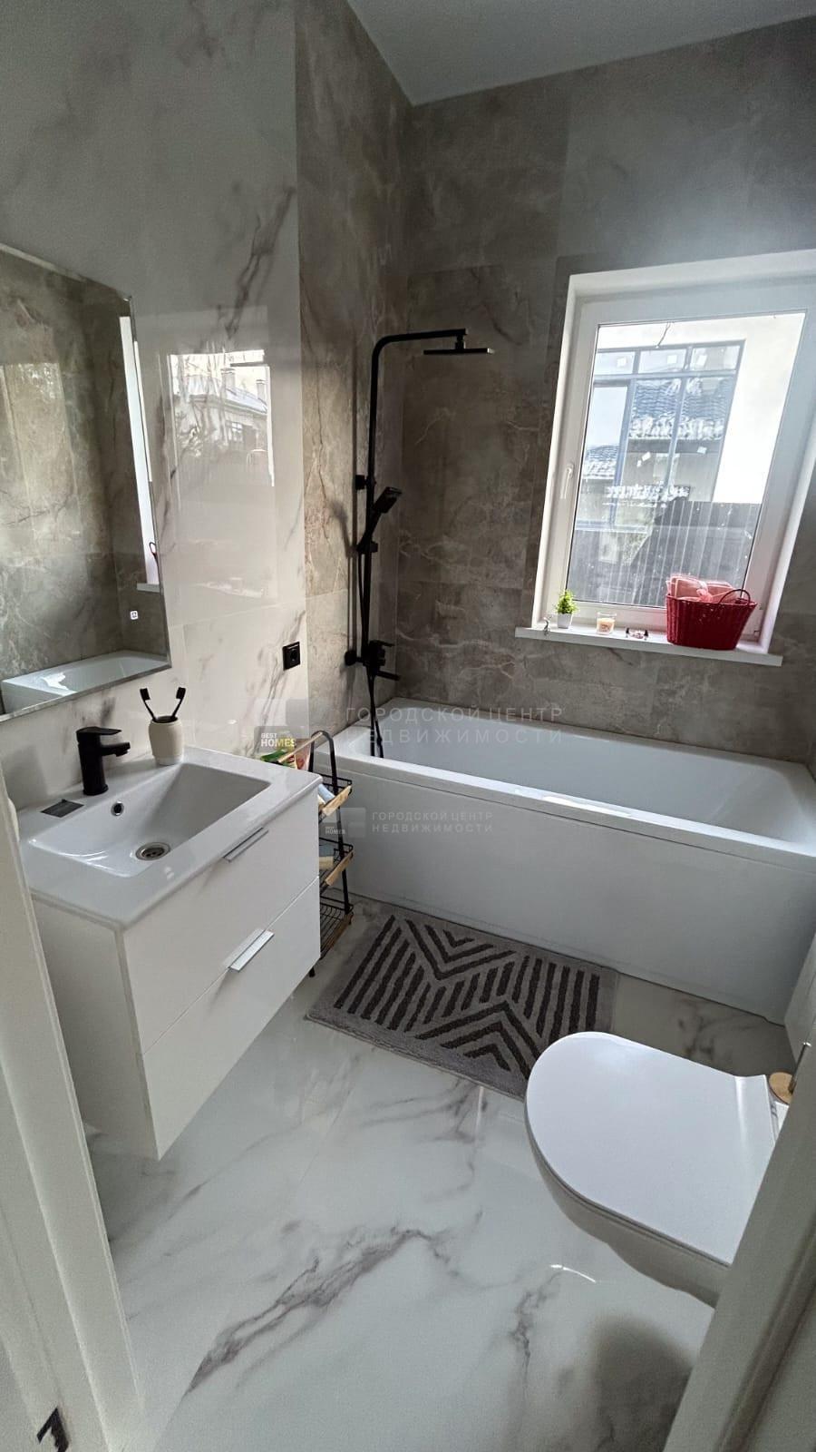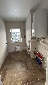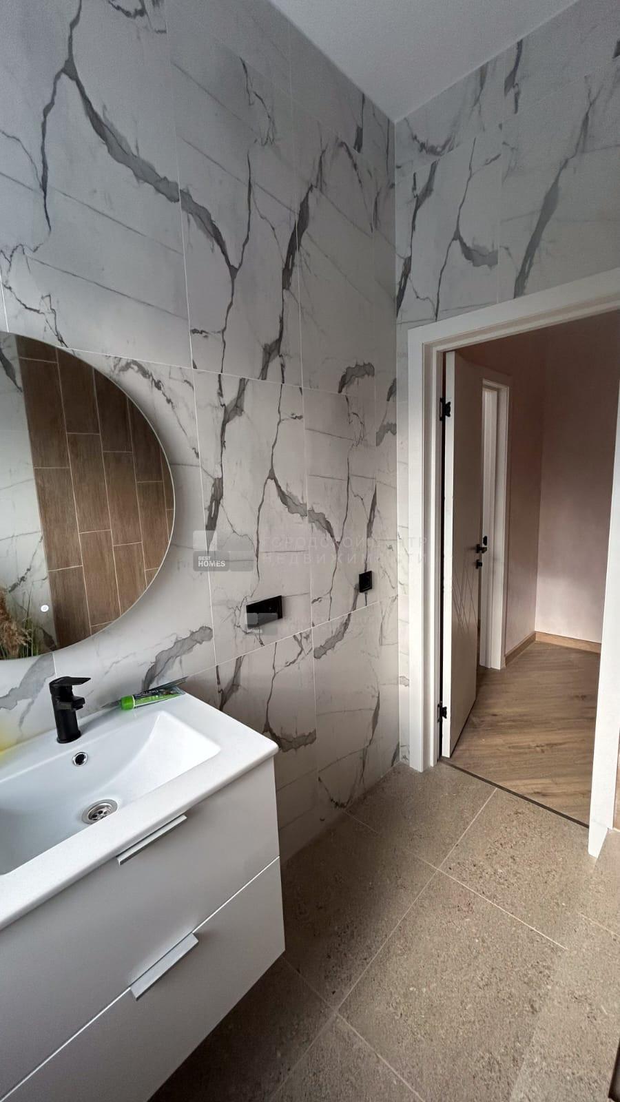 В доме водяные теплые полы, материал пола керамогранит, стены обои и покраска, потолок натяжной, в доме установлена сантехника и освещение.