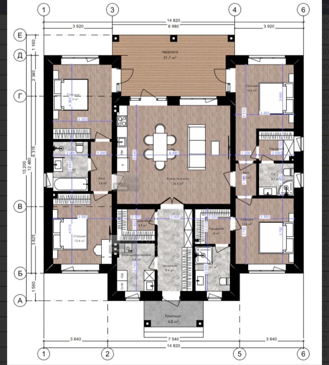 Дом имеет 4 спальни, 3 санузла, 3 гардероба, большую кухню-гостиную и террасу.