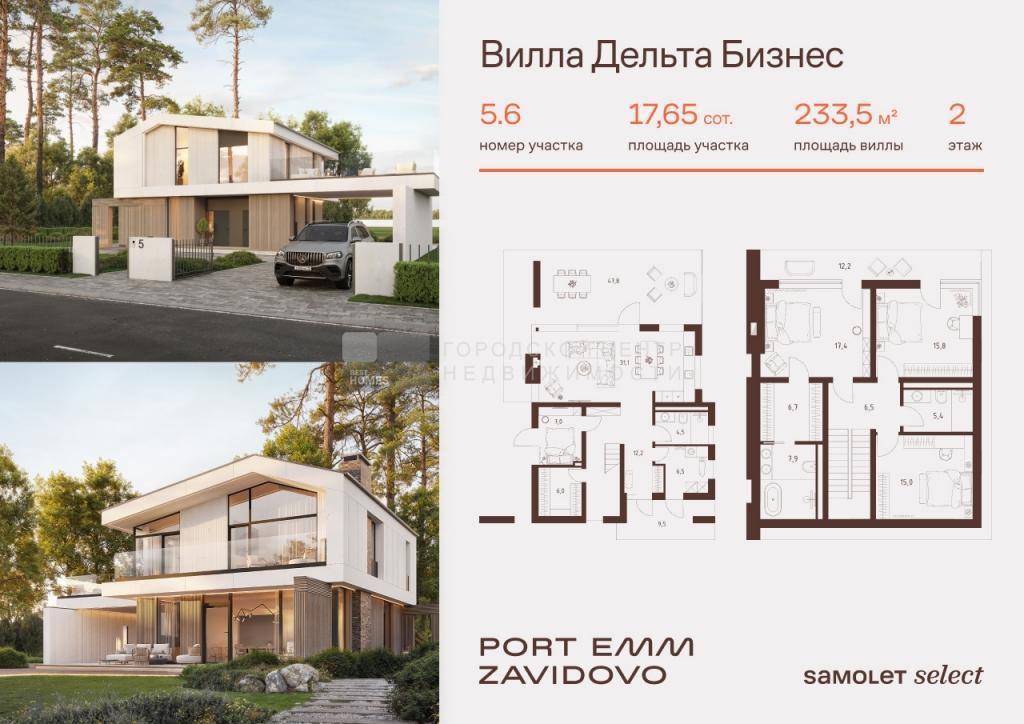 В продаже вилла площадью 233,5 м2 на участке 17,65 соток от застройщика «Самолет» в загородном проекте PORT EMM ZAVIDOVO.