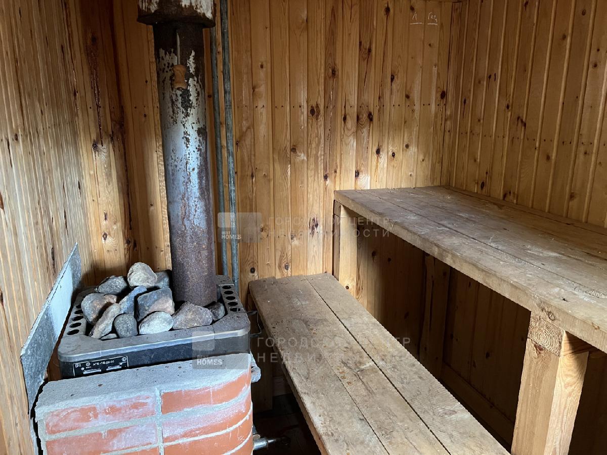 Внутри предбанник, помывочная с душем (ХВ и ГВ), парная с печью на дровах.