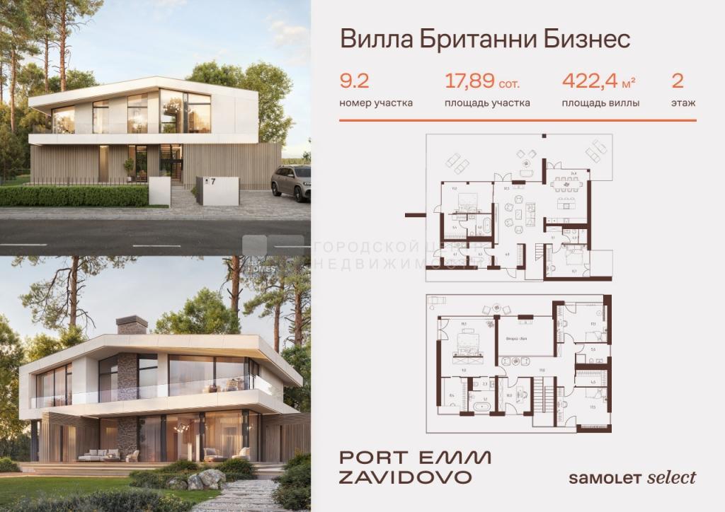 В продаже вилла площадью 422,4 м2 на участке 17,89 соток от застройщика «Самолет» в загородном проекте PORT EMM ZAVIDOVO.