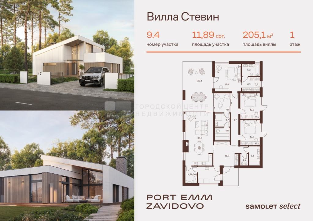 В продаже вилла площадью 205,1 м2 на участке 11,89 соток от застройщика «Самолет» в загородном проекте PORT EMM ZAVIDOVO.