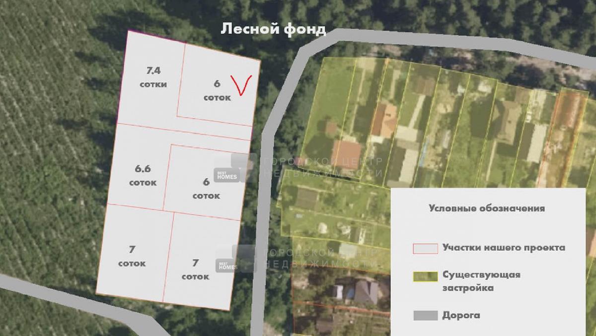 Участок правильной праямоугольной формы 23м на 26 м расположен в минипоселочке на 6 домовладений рядом с СНТ "Восход".