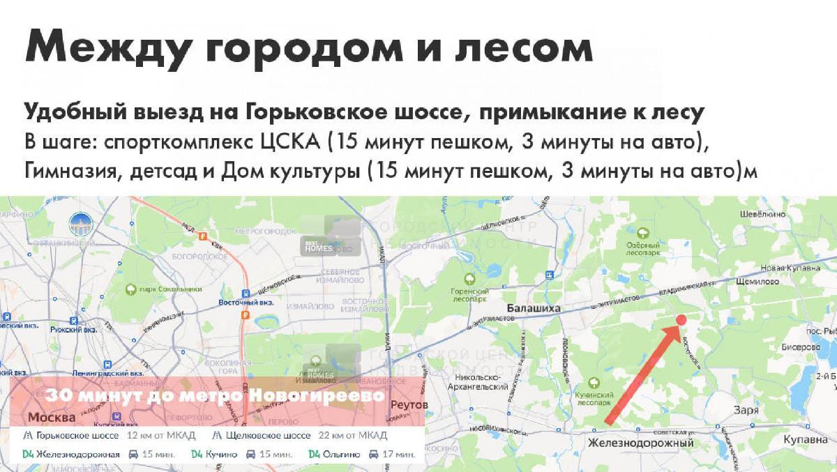В 7 мин хотьбы от участка автобусная остановка в Балашиху, до ж/д ст. Заря. также автобусом можно добраться до Москвы ст.м. Измайловская.