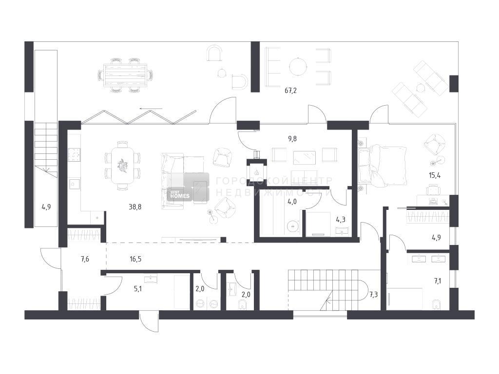 Комфортная вилла с просторной кухней-гостиной, мастер-спальней, кабинетом, гардеробной и благоустроенным и огороженным просторным участком.