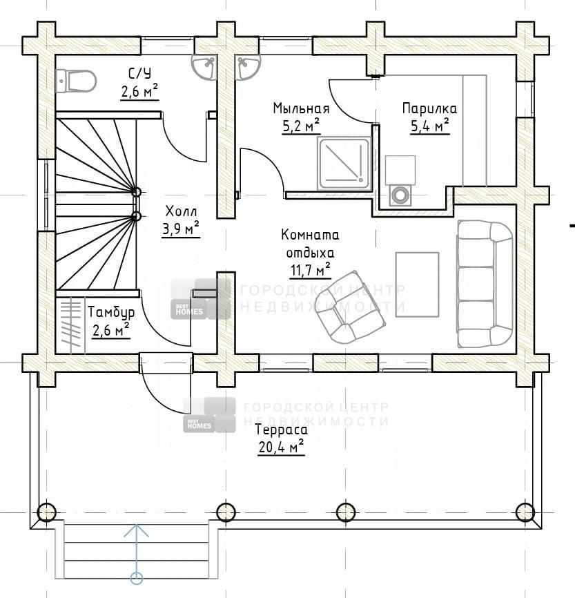1 этаж - тамбур, холл, с/у, душевая, парилка, кухня-гостиная (11,7 кв м)