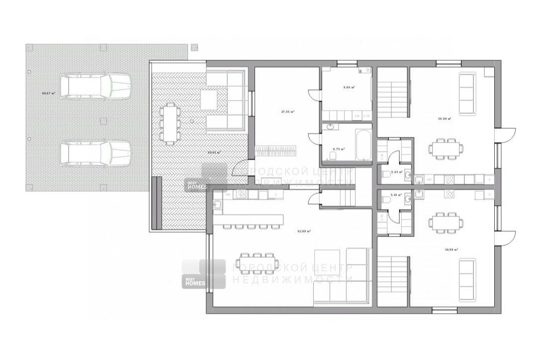 · Участок: Крытая стоянка на 2 авто (75 м?), открытая стоянка, терраса 100 м?, зона отдыха с уличной кухней (50 м?).