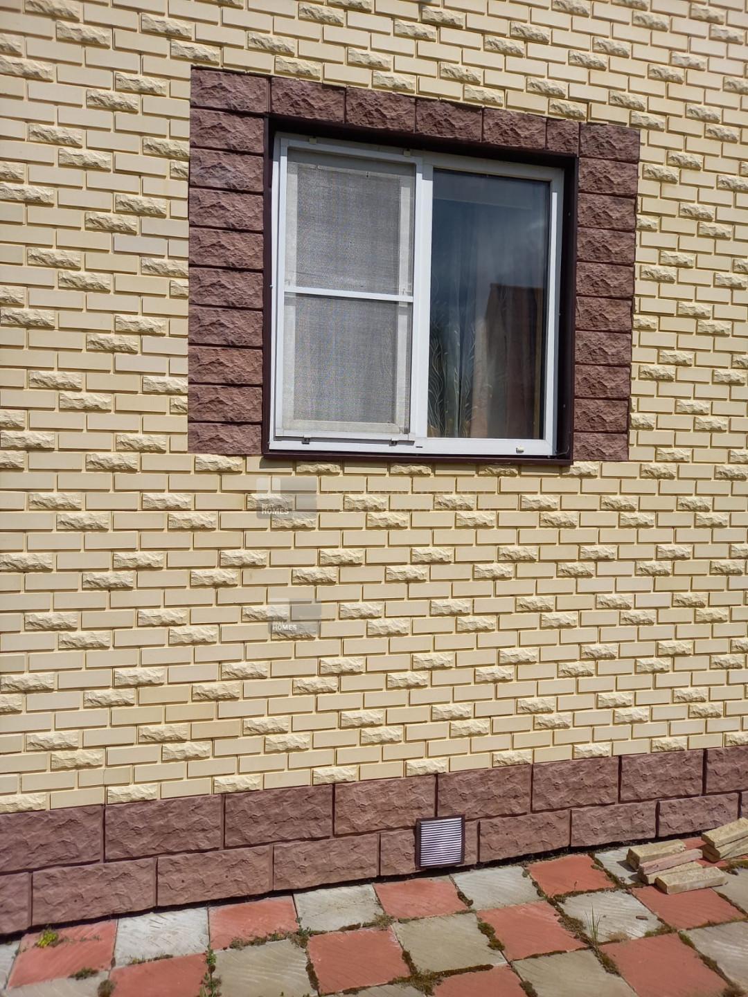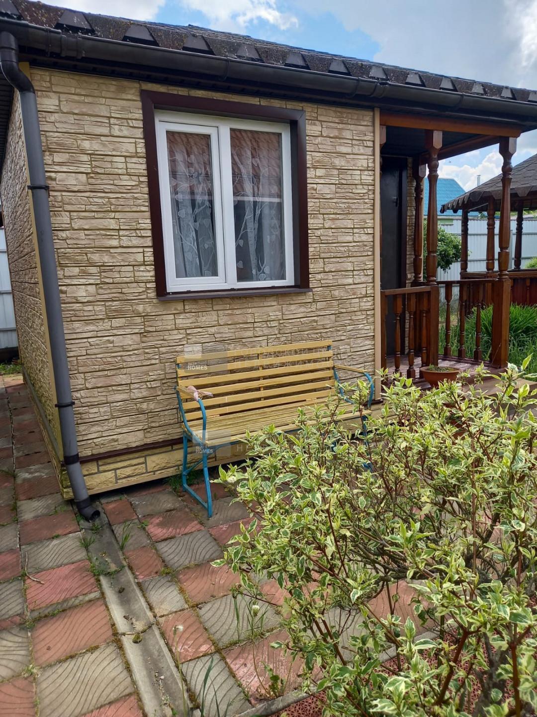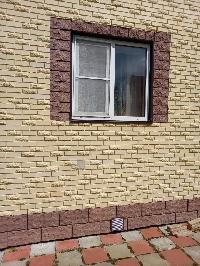 Снаружи облицован природным камнем. Использовано красивое контрастное сочетание светлого цвета стен и темного цвета наличников и цоколя.