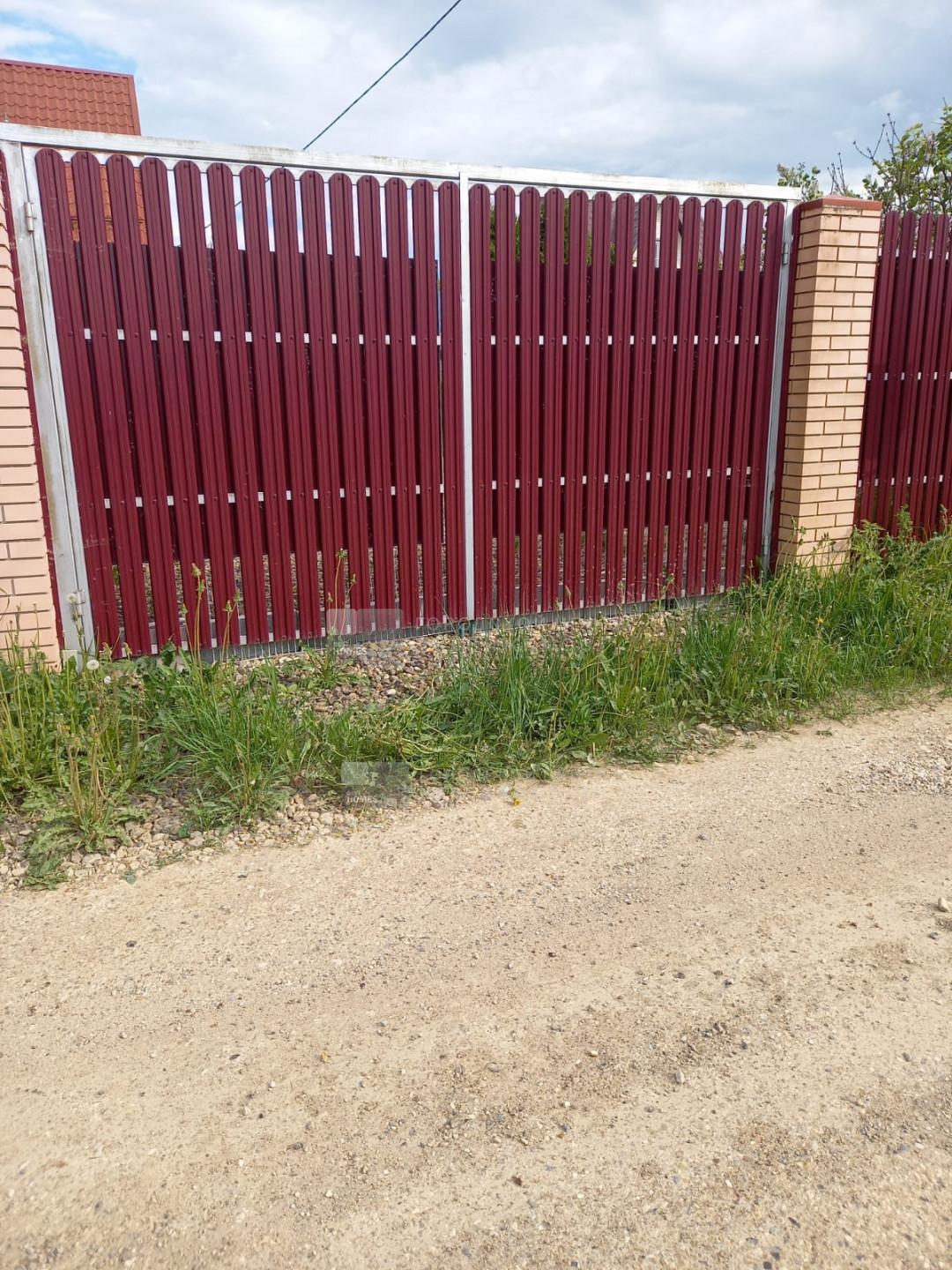 Участок 7,74 соток правильной прямоугольной формы со всех сторон окружен забором (с трех сторон профнастил, по фасаду металлический штакетник бордового цвета).