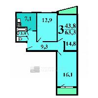 Общая площадь квартиры - 63.6 кв. м, все комнаты изолированные - 12.9, 14.8 и 16.4 кв.м., кухня — 7.1 кв. м., высота потолков- 2.65 м. Окна двух комнат и кухни выходят во двор, у одной комнаты- окна на улицу. Застекленные лоджии в двух комнатах. Квартира под ремонт!!