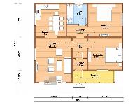 На входе крытая терраса 7,5 м2, тамбур 3 м2, холл 8 м2, гостиная 25 м2, отделенная от нее изящной аркой кухня 12 м2, две спальни по 17 м2, совмещенный с/у и второй туалет-бойлерная, где расположены все коммуникации дома.